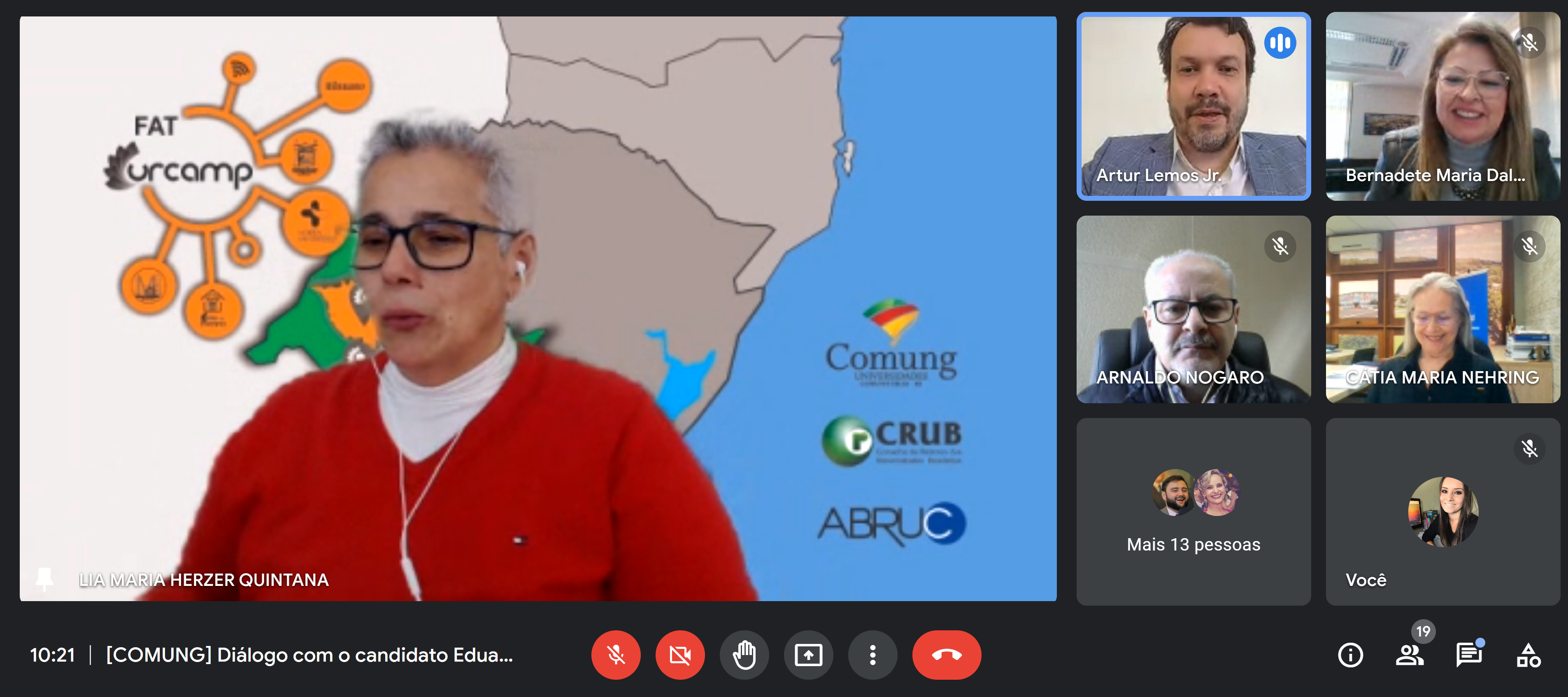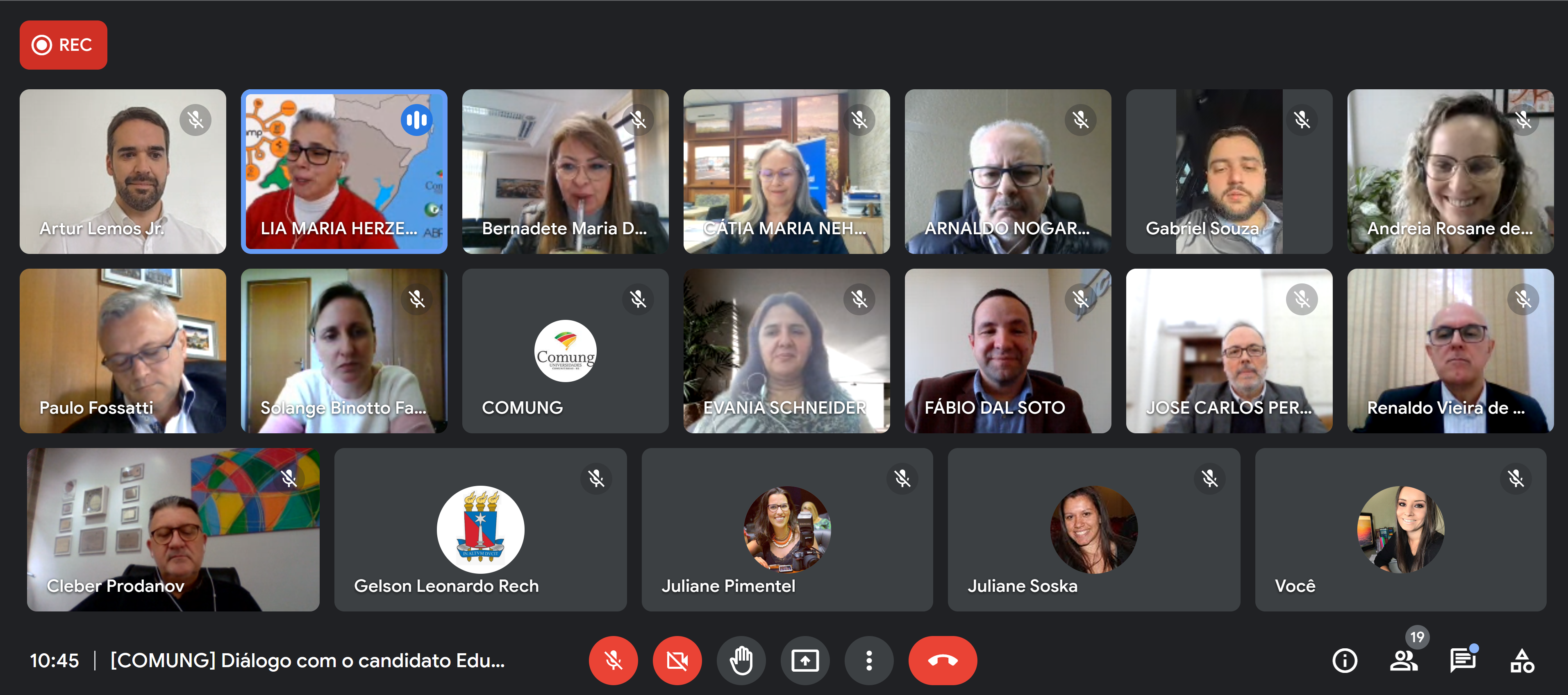 Participaram do encontro: Lia Maria Herzer Quintana, reitora da Urcamp e presidente do Comung; Cleber Prodanov, reitor da Feevale e vice-presidente do Comung; Cátia Maria Nehring, reitora da Unijuí e tesoureira do Comung; Bernadete Maria Dalmolin, reitora da UPF e secretária do Comung; Gelson Leonardo Rech, reitor da UCS; Solange Binotto Fagan, vice-reitora da UFN; Arnaldo Nogaro, reitor da URI; Evania Schneider, reitora da Univates; Irmão Paulo Fossatti, reitor da Unilasalle; Renaldo de Souza, chefe de Gabinete da Unilasalle; Fábio Dal-Soto, reitor da Unicruz; José Carlos Pereira Bachettini Júnior, reitor da Ucpel; Andreia Rosane de Moura Valim, vice-reitora da UNISC.